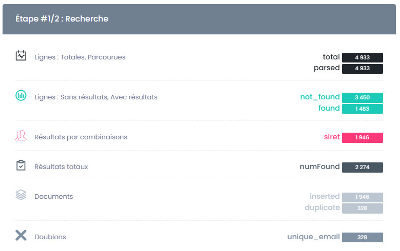 Lignes avec / sans résultats : détaille le nombre total de lignes pour lesquelles un résultat a été trouvé, et celles n'ayant pas renvoyé de résultat.