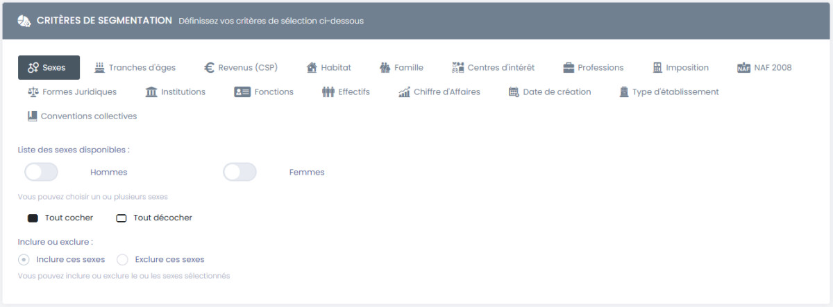 Cette catégorie permet de cibler les profils de particuliers avec de nombreux critères cumulables : critères socio-démographiques, famille, habitat, profession, centres d'intérêt...