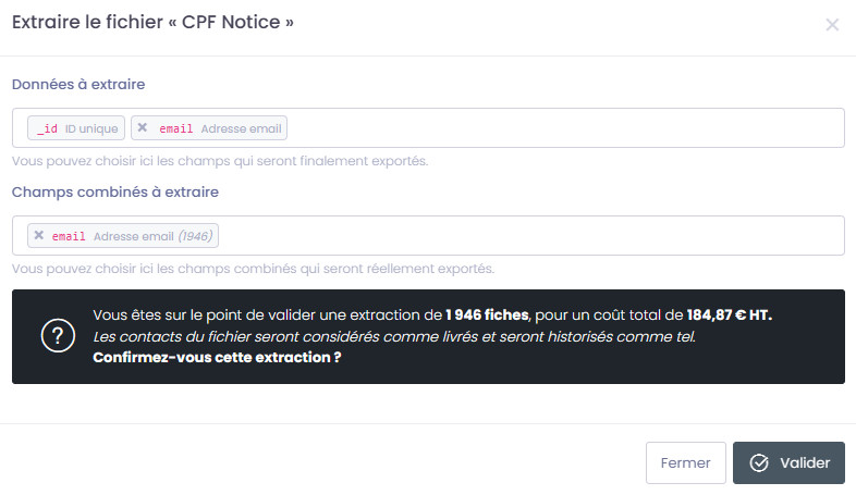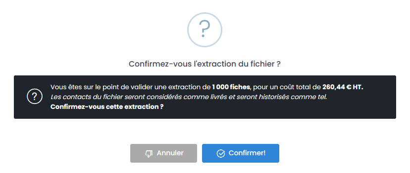 Ces informations vont déterminer les montants qui seront facturés ensuite selon usage défini (disposition des fiches) et selon le ou les canaux de contacts enrichis sélectionnés.