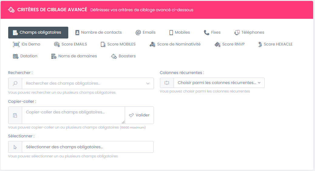 Sélectionnez ensuite vos autres critères de ciblage, afin de finaliser votre sélection Datas (canal de contact, routage, critères de segmentation, repoussoirs, …), et obtenir la volumétrie globale de votre sélection.