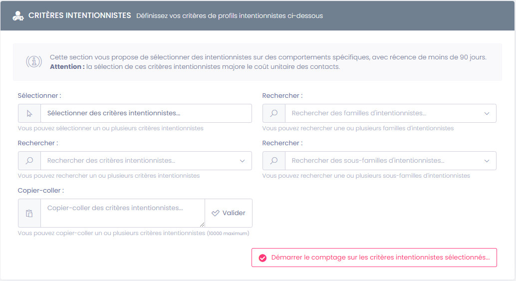 Au fur et à mesure de votre sélection, le volume correspondant à vos critères de ciblage va s'actualiser dans le cartouche à droite de l'espace de comptage. Une fois votre sélection finalisée, vous pouvez valider votre ciblage.