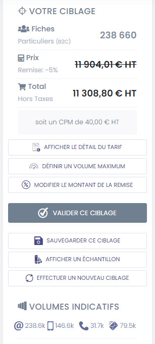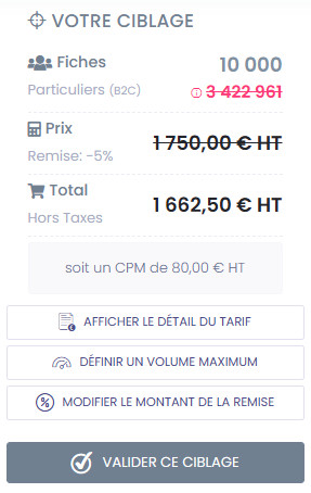 Le volume de contacts ciblés, ainsi que le tarif associé, vont alors s'actualiser dans le cartouche de validation, en fonction des paramètres sélectionnés.