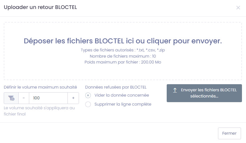 Importez ou déposez le fichier .zip qui vous a été fourni par Bloctel post-traitement, dans l'espace "Déposer".