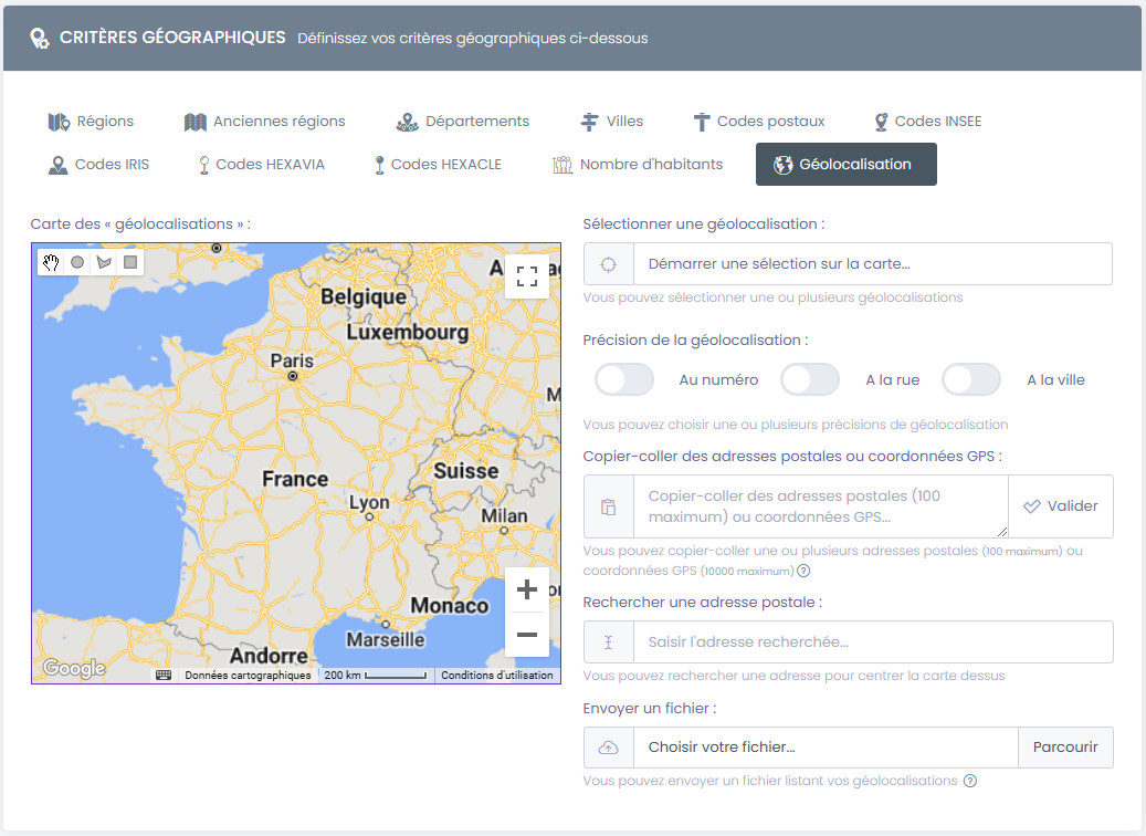 L'onglet "géolocalisation" des critères géographiques, permet de cibler des adresses postales précises, et/ou des coordonnées GPS, et de définir autour de ces adresses un radius exprimé en mètres, ou un temps de trajet à pied / en vélo / en voiture / en transports.