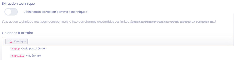 Définir cette extraction comme technique : cette fonctionnalité vous permet de réaliser une pré-extraction d'un comptage, pour un traitement technique préalable (par exemple un expurge Bloctel, un traitement Estocade, une déduplication externe …). Cette fonctionnalité vous donne accès à une liste restreinte de champs exportables (données hashées / export de données en clair non disponible pour un export technique).