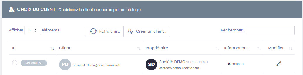 Choisir un Client : cette option, réservée aux utilisateurs ayant un statut Commercial ou Administrateur, permet d'associer l'enrichissement à un client précis.